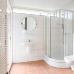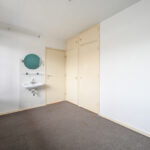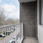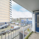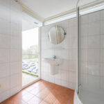 Keurige volbetegelde badkamer aan de voorzijde van het appartement met een halfronde douchecabine, vaste wastafel, handdoekradiator en een modern toilet met een hangcloset en inbouwreservoir. Slaapkamer aan de voorzijde van het appartement waarbij vanuit de slaapkamer en badkamer toegang tot een balkon.