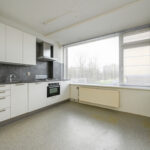 Aan de voorzijde van het appartement is de halfopen keuken gesitueerd in hoekopstelling met o.a. een 4-pits gaskookplaat, afzuigkap, vaatwasser, oven, close-in boiler en een losse koel-/vriescombinatie.