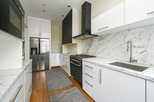 Aan de achterzijde bevindt zich de smaakvolle keuken, voorzien van onder andere een fraai 6-pits Boretti gasfornuis, afzuigkap, vaatwasser, veel kastruimte en een Amerikaanse koel-/vriescombinatie. Vanuit de keuken is er toegang tot een balkon.