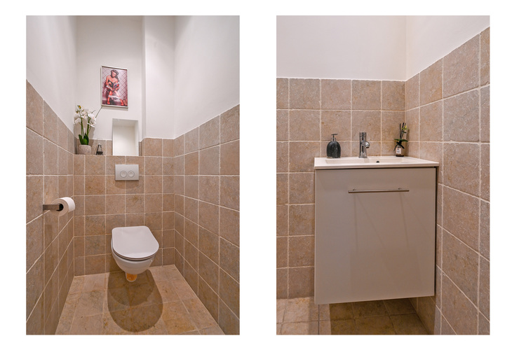 Al bij aankomst op de overloop valt direct het uitmuntende afwerkingsniveau op: strak stucwerk, luxe dubbele binnendeuren en een prachtige parketvloer. Op deze verdieping bevindt zich tevens een separaat, modern toilet, uitgevoerd met een hangcloset, inbouwreservoir en een compact wasmeubel.