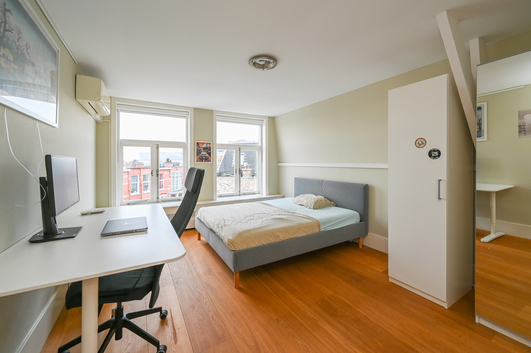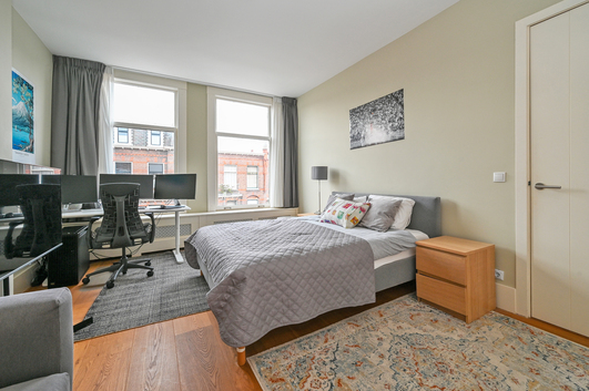 Aan de achterzijde van de woning ligt een royale slaapkamer, voorzien van airconditioning. Daarnaast bevindt zich op deze verdieping een ruime, volledig betegelde tweede badkamer, uitgevoerd met een inloopdouche, breed wasmeubel met dubbele kraan, handdoekenradiator en een toilet met hangcloset en inbouwreservoir.