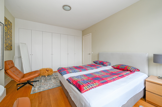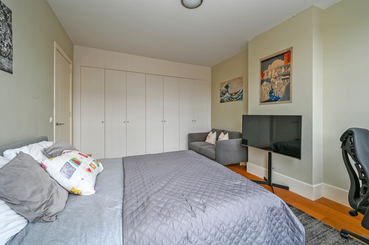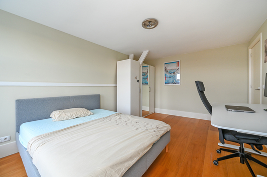Op de overloop bevindt zich een vaste kast met de opstelplaats voor een was-/droogcombinatie. Aan de voorzijde ligt een werk-/slaapkamer, ideaal als thuiswerkplek of logeerkamer, met praktische kastruimte. Daarnaast bevindt zich aan de voorzijde een riante slaapkamer, eveneens voorzien van fraai ingebouwde kastruimte.