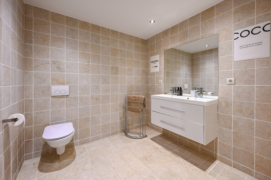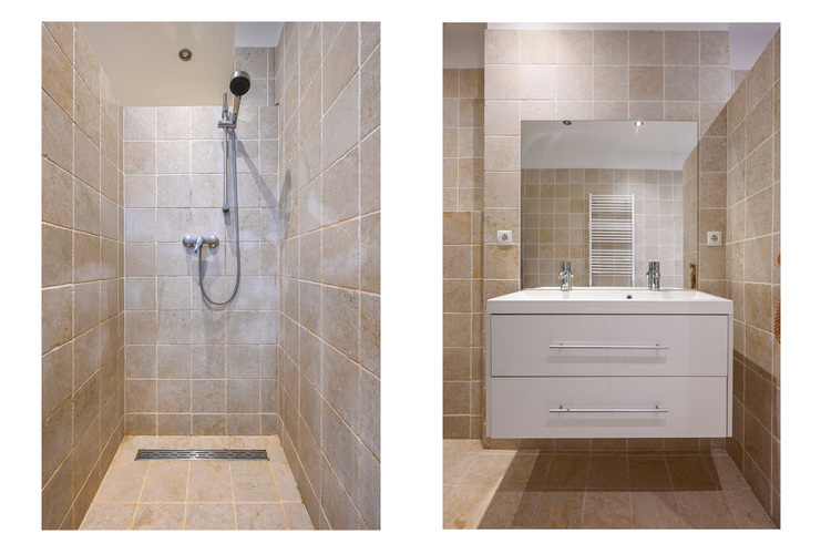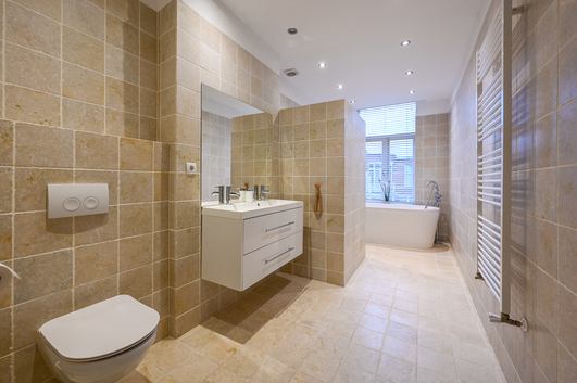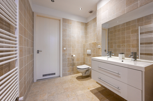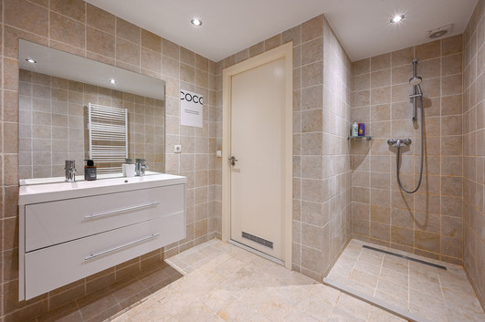 Aan de achterzijde is de moderne en complete badkamer gesitueerd, uitgevoerd met een vrijstaand ligbad, inloopdouche, breed wasmeubel met dubbele kraan, handdoekenradiator en een toilet met hangcloset en inbouwreservoir.
