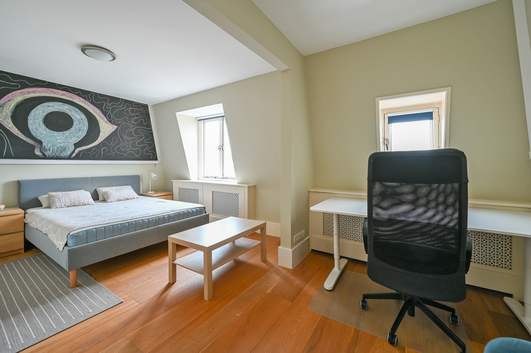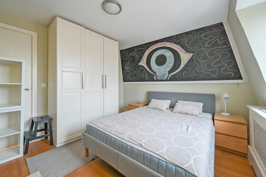 Aan de voorzijde bevindt zich een tweede royale slaapkamer, voorzien van twee dakkapellen.