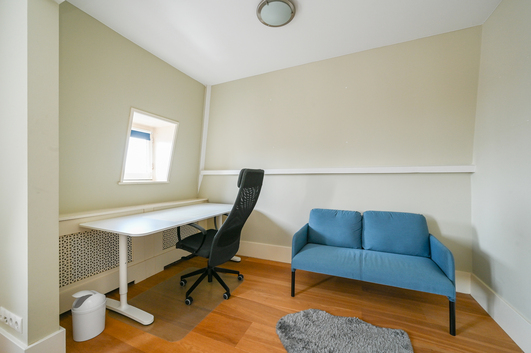 Aan de voorzijde van de woning ligt een slaap-/werkkamer met praktische kastruimte en garderobe.