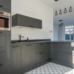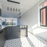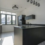 Aan de voorzijde van de woning bevindt zich een royale keuken in een praktische hoekopstelling, die dankzij de trendy kleurstelling een moderne uitstraling heeft. De keuken is uitgerust met hoogwaardige inbouwapparatuur, waaronder een Bora inductiekookplaat met geïntegreerde afzuigunit, een koelkast, vriezer, combimagnetron en vaatwasser. Deze volledig uitgeruste keuken biedt niet alleen veel werkruimte, maar maakt koken ook bijzonder comfortabel en stijlvol.