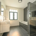 1e verdieping: overloop met een modern toilet voorzien van een hangcloset, inbouwreservoir en een fonteintje. De charmante masterbedroom aan de achterzijde van de woning is rustig gelegen, compleet met een praktische inloopkast en prachtig uitzicht over de achtertuin. Aan de voorzijde bevindt zich een lichte slaapkamer , waar een extra raam in de zijgevel zorgt voor een aangename lichtinval en een ruimtelijk gevoel. De luxe en volbetegelde badkamer is voorzien van een comfortabel ligbad, een ruime douchecabine, een breed wasmeubel met dubbele kraan en een handdoekenradiator.