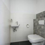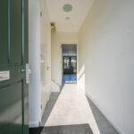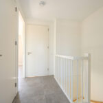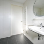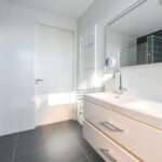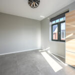 Aan de voorzijde bevindt zich een lichte slaapkamer, waar een extra raam in de zijgevel zorgt voor een aangename lichtinval en een ruimtelijk gevoel. De tweede badkamer is voorzien van een douchecabine, een vaste wastafel en een toilet met een hangcloset en inbouwreservoir.