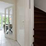 Entree tot de woning; hal met vaste kast en meterkast (8 groepen). Separaat modern toilet voorzien van een hangcloset, inbouwreservoir en een fonteintje. Tussenhal met trapopgang naar de eerste verdieping, vaste kast voor garderobe en toegang tot de ruime woonkeuken op de begane grond met een overhangend terras op het NoordWesten. De vernieuwde keuken in hoekopstelling is voorzien van een inductiekookplaat, afzuigkap, carrousel, koel-/vriescombinatie, oven en een combimagnetron. Werkbladverlichting via led-spots. Door de grote raampartijen is het hier prettig verblijven waardoor deze ruimte door de huidige eigenaren als een tweede woonkamer wordt gebruikt.