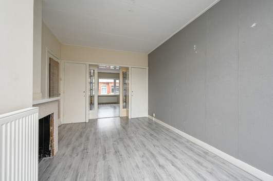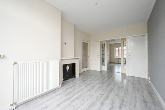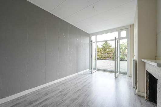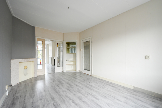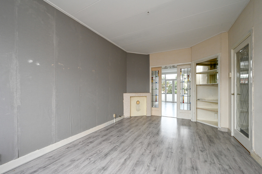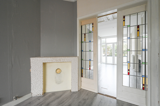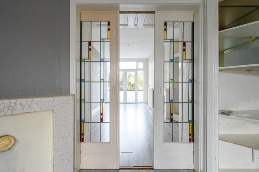 De verrassend ruime woonkamer ensuite beschikt over de originele schuifseparatie met vaste kasten en glas-in-looddeuren. Aan de voorzijde biedt de woonkamer een charmant uitzicht over de rustige straat, terwijl aan de achterzijde de eetkamer ligt, die desgewenst ook als derde slaapkamer gebruikt kan worden. Via de openslaande deuren in de woonkamer is er toegang tot het balkon, dat tevens bereikbaar is vanuit de keuken.