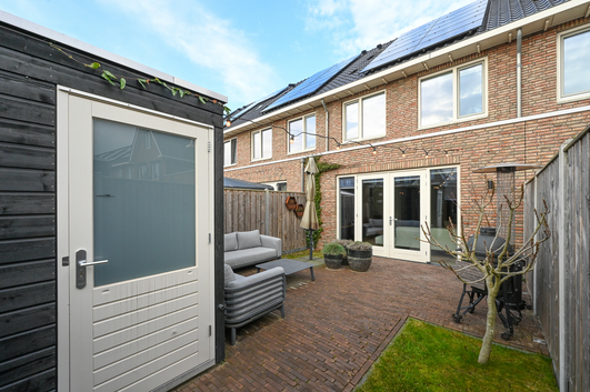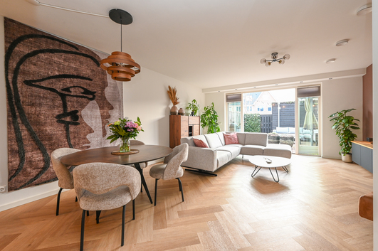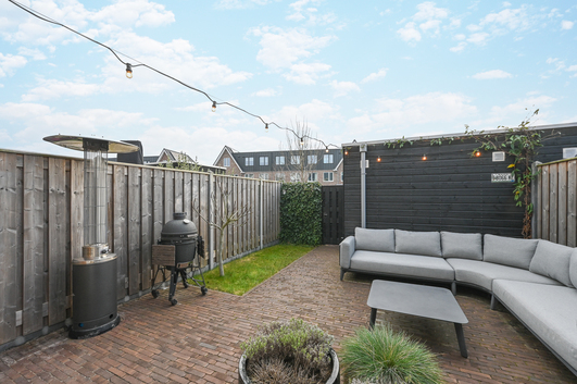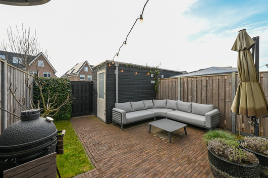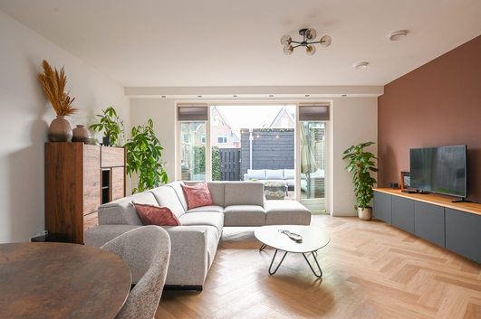 De fantastisch ruime living is vergroot met een 1,20 meter diepe aanbouw en afgewerkt met een prachtige PVC-vloer in visgraatmotief. Via de openslaande deuren is er toegang tot de achtertuin met een gunstige zonligging, waardoor je hier verzekerd bent van heerlijke zonuren. Praktisch zijn de houten berging en de achterom naar de eigen parkeerplaats.