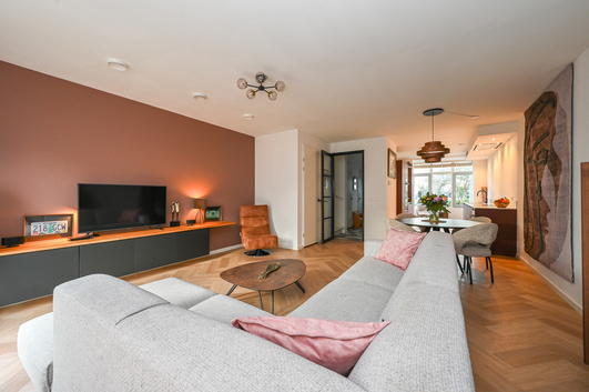 Aan de voorzijde bevindt zich de trendy keuken, compleet uitgerust met hoogwaardige inbouwapparatuur en voorzien van veel werk- en bergruimte. De smaakvolle badkamer is vergroot en daardoor extra royaal en praktisch ingedeeld.