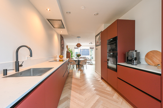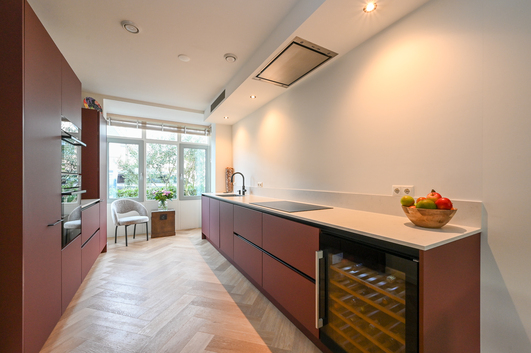 Aan de voorzijde van de woning bevindt zich de trendy keuken met een rechte opstelling en een strakke kastenwand. De keuken is compleet uitgerust met hoogwaardige apparatuur, waaronder een inductiekookplaat, afzuigkap, vaatwasser, Quooker, wijnklimaatkast, grote koelkast, grote vriezer, oven met stoomfunctie en combi-magnetron. Extra prettig is het aanvullende werkblad, ideaal te gebruiken als koffiecorner.
