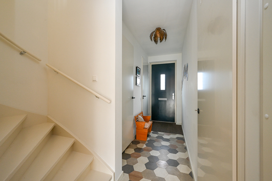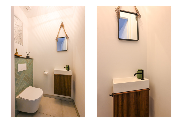 Via de fraai aangelegde voortuin betreed je de woning. In de hal valt direct het strakke stucwerk en de fraaie vloerafwerking op. Hier bevinden zich de meterkast (15 groepen) en een vaste kast met de opstelplaats van de warmtepomp (eigendom) en het boilervat van 200 liter. Het moderne toilet is stijlvol uitgevoerd met een hangcloset, inbouwreservoir en een compact wasmeubel.