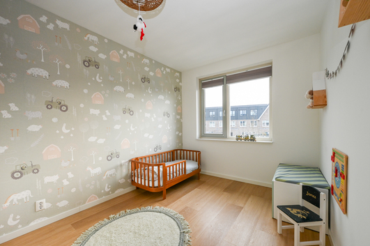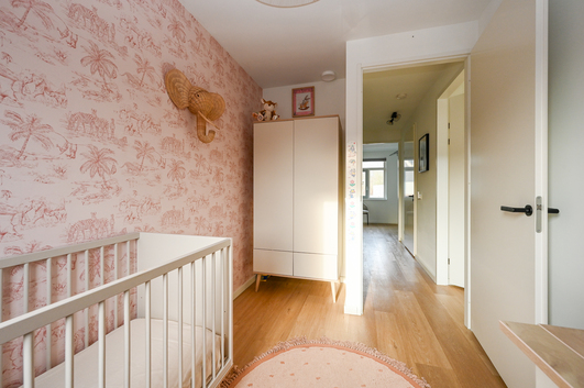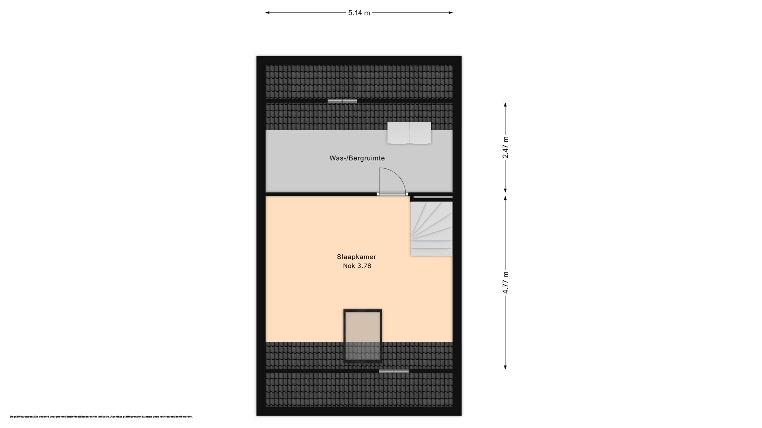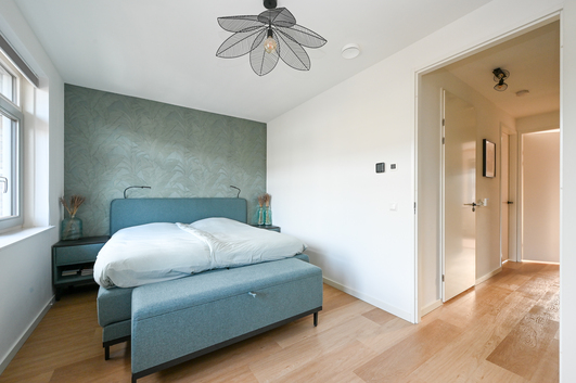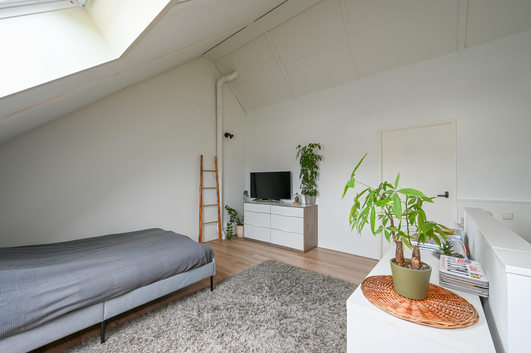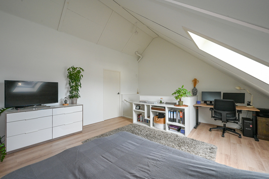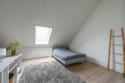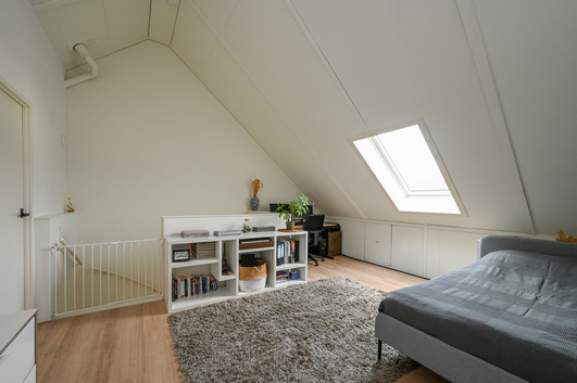 Tweede verdieping: aan de voorzijde van de woning bevindt zich een riante slaapkamer met een indrukwekkende nokhoogte van circa 3,78 meter. Dit geeft de ruimte een heerlijk open karakter, versterkt door het grote dakraam dat zorgt voor veel daglicht. Achter de knieschotten is bovendien volop bergruimte aanwezig.