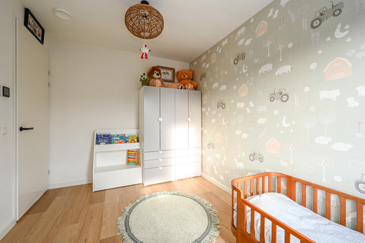 Vanuit deze slaapkamer is er toegang tot de praktische wasruimte, waar zich de unit WTW en de inverter van de zonnepanelen bevinden. Daarnaast is hier de opstelplaats voor zowel wasmachine als wasdroger, met extra ruimte voor opslag.