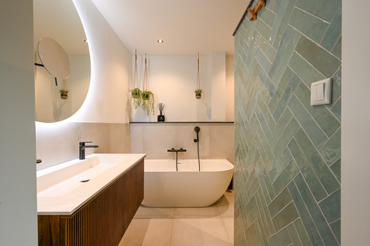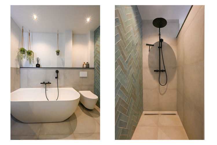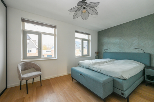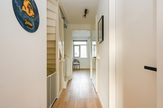Eerste verdieping: ruime overloop met aan de voorzijde van de woning een riante masterbedroom met een prettig straatbeeld. De smaakvolle badkamer is tijdens de bouw vergroot en beschikt over een ligbad, inloopdouche, breed wasmeubel en een tweede toilet met hangcloset en inbouwreservoir. Het verlaagde plafond met inbouwspots geeft de badkamer een luxe uitstraling.
