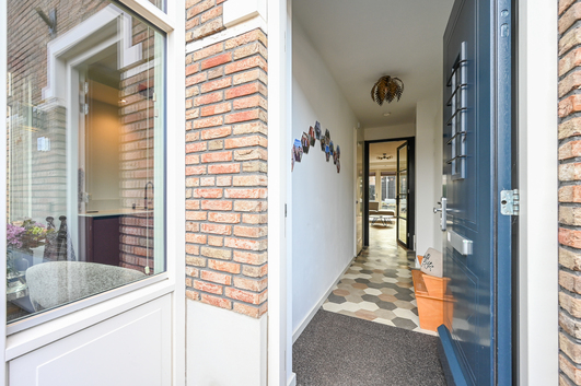 Slim is de deur met een leuk zicht op de woonkamer en aansluitend de tuin. Tevens zorgt dit voor veel lichtinval in de hal.
