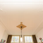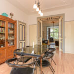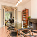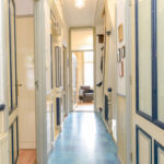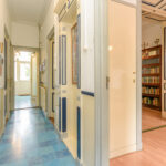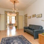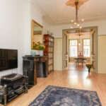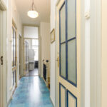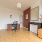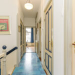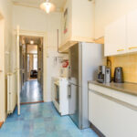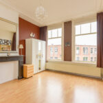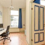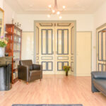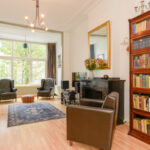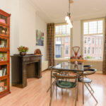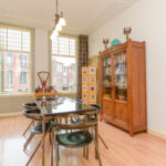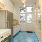 1e verdieping: overloop, toilet met fonteintje, vaste kast met mogelijkheid voor een douche of wasruimte. Fijne woonkamer ensuite met de kenmerkende kastruimte en schuifdeuren, fraaie schouwen en schitterende plafonddetails. Werkkamer aan de voorzijde van het appartement. De keuken is aan de achterzijde van het appartement gelegen met een rechte opstelling en toegang tot een balkon. Bruynzeel, een begrip als keuken is voorzien van een losstaand gasfornuis, losstaande vaatwasser, losstaande koel-/vriescombinatie, geiser en inbouwkast met mooi lijstwerk. Vanuit de keuken toegang tot de woonkamer via een deur.