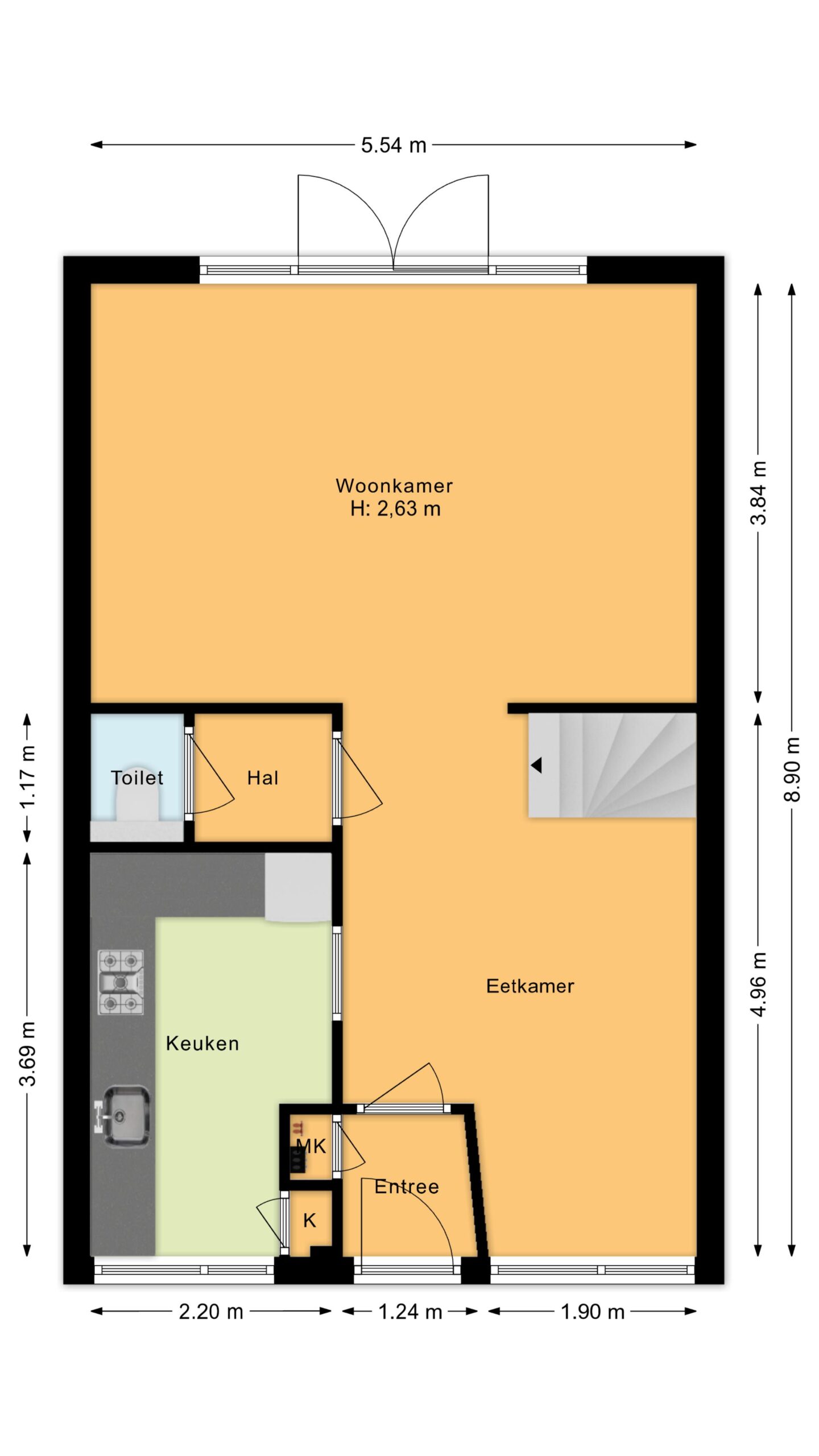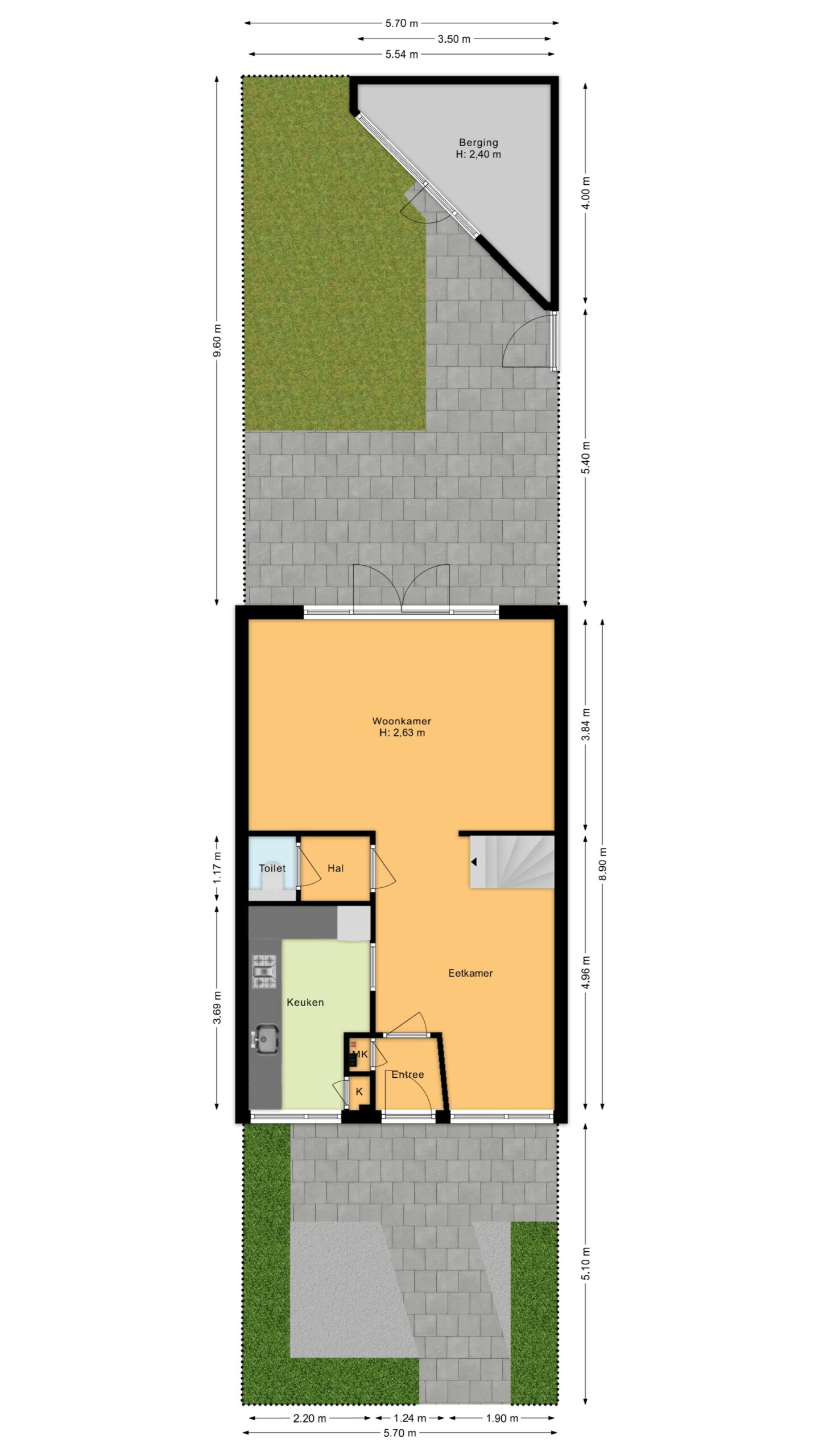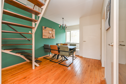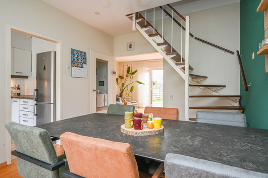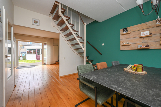 De voortuin is verzorgd aangelegd met sierbestrating en fleurige borders, wat zorgt voor een uitnodigende entree. Bij binnenkomst treft u de hal met meterkast (6 groepen). Aan de voorzijde van de woning bevindt zich de gezellige eetkamer met trapopgang.