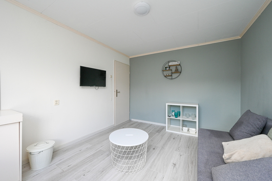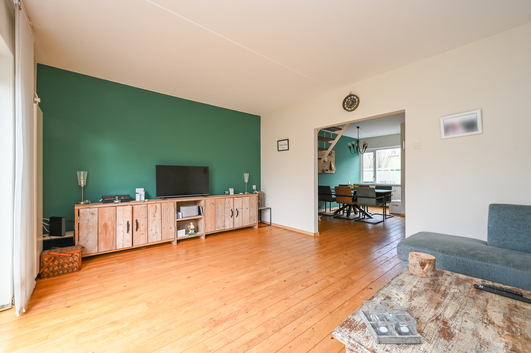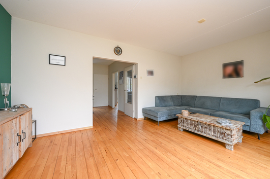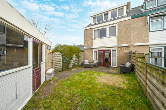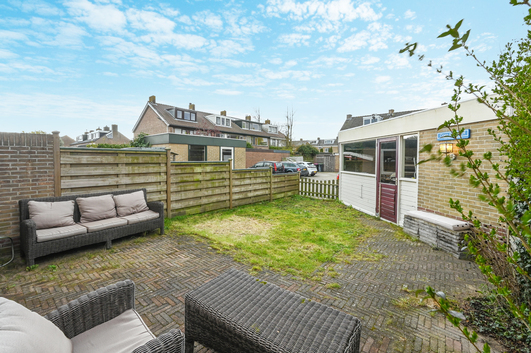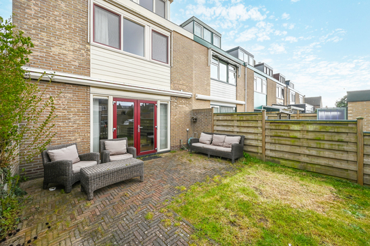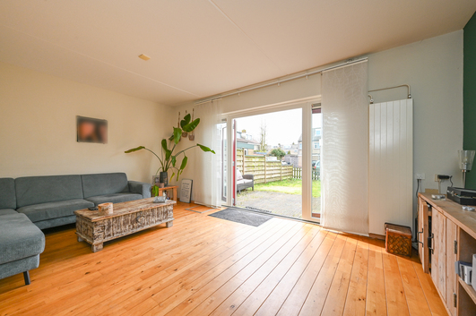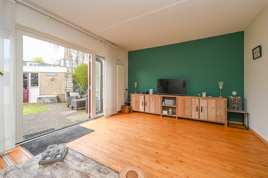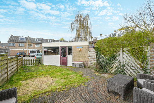 De tuingerichte woonkamer is ruim opgezet en kenmerkt zich door een prettige lichtinval en fraaie zichtlijnen naar de tuin. Via openslaande deuren heeft u direct toegang tot de zonnige achtertuin, welke beschikt over een royale stenen berging en een praktische achterom. Aan de achterzijde van de woning bevindt zich parkeergelegenheid, wat zorgt voor extra comfort en gemak.