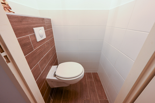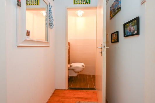 Via een tussenhal bereikt u het moderne toilet, uitgevoerd met een hangcloset en inbouwreservoir.