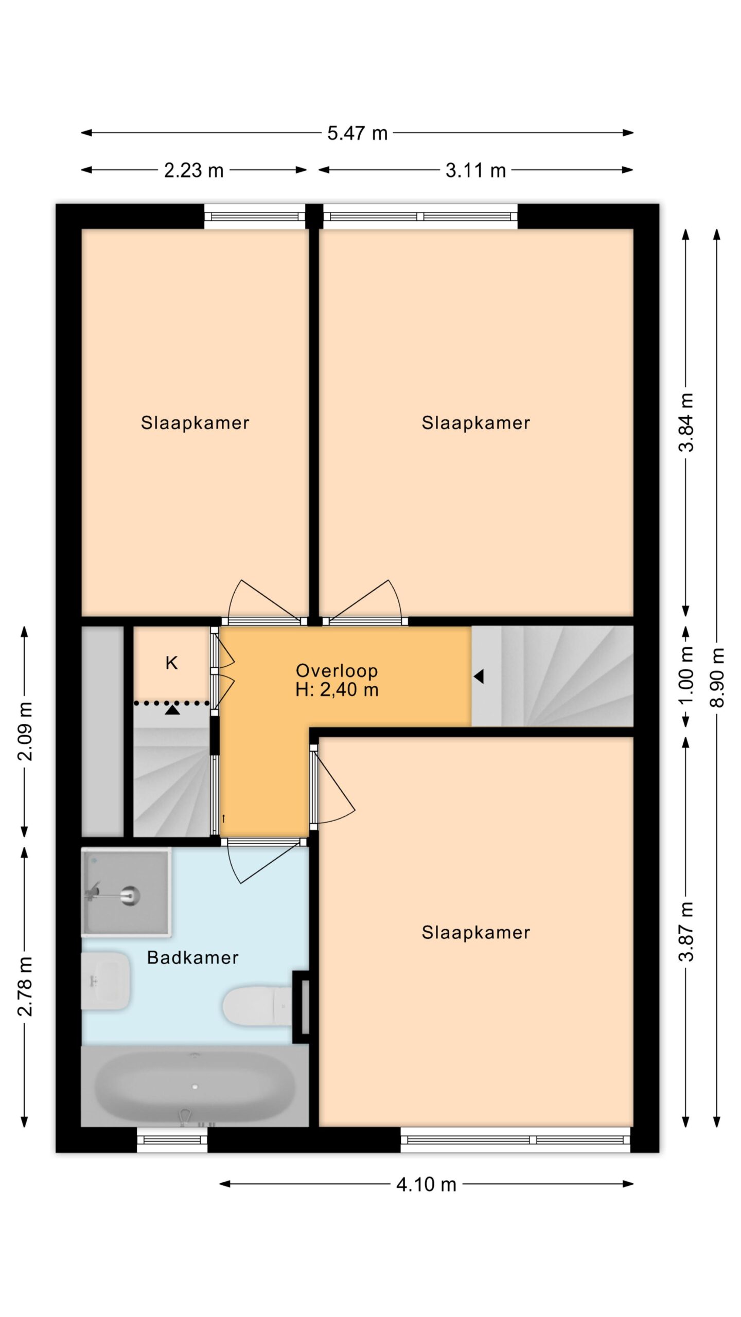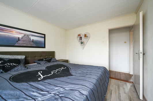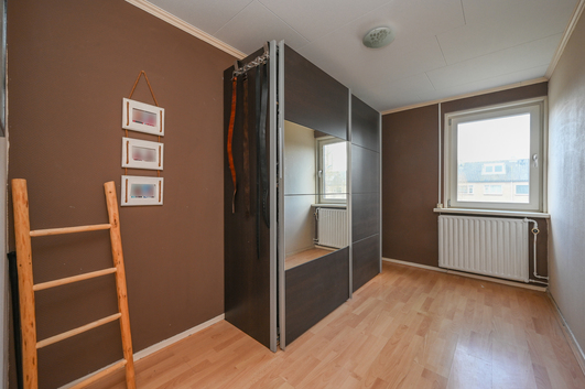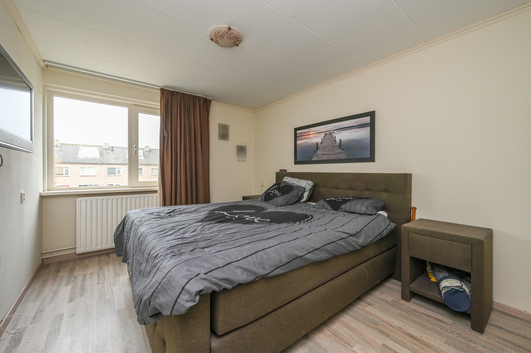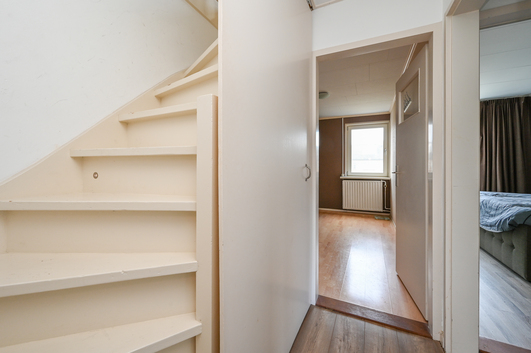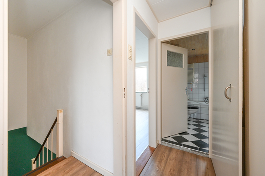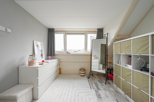 De overloop geeft toegang tot drie ruime slaapkamers, een vaste kast en de badkamer aan de voorzijde van de woning. De twee slaapkamers aan de achterzijde bieden een leuk en vrij uitzicht over de achtertuin. De slaapkamer aan de voorzijde kijkt uit over de autovrije strook, wat zorgt voor een prettig en vrij uitzicht.
