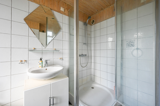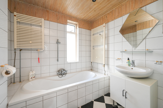 De badkamer is compleet uitgevoerd en voorzien van een ligbad, douchecabine, wastafelmeubel en een toilet met hangcloset en inbouwreservoir.