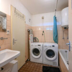 De badkamer is voorzien van een ligbad met douchegelegenheid, een vaste wastafel, opstelplaats voor een was-/droogcombinatie en een opstelplaats voor een boiler (huur 80 liter).