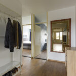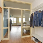 - Voorzijde voorzien van houten kozijnen met dubbel glas