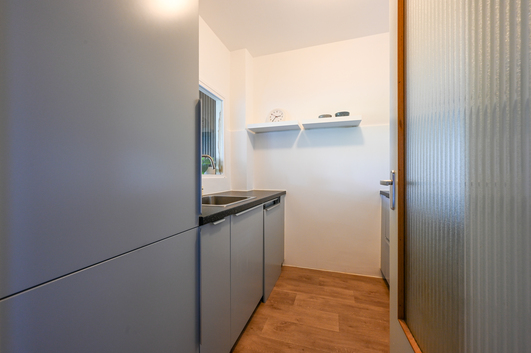 De moderne keuken in twee rechte opstellingen is van alle gemakken voorzien: een 4-pits gaskookplaat, afzuigkap (recirculatie), oven, vaatwasser en koel-/vriescombinatie. Ideaal voor de kookliefhebber!