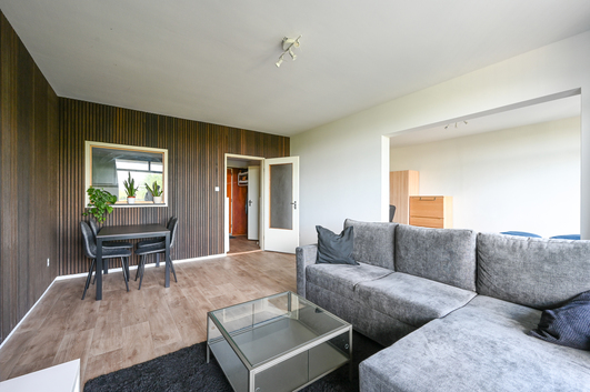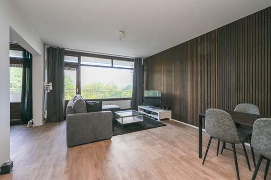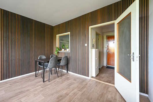 De sfeervolle woon-/eetkamer biedt directe toegang tot het royale balkon, dat zich uitstrekt over de volledige breedte van het appartement. Dankzij de gunstige zonligging is dit de perfecte plek om na een werkdag heerlijk te ontspannen en te genieten van het vrije uitzicht richting Kijkduin.