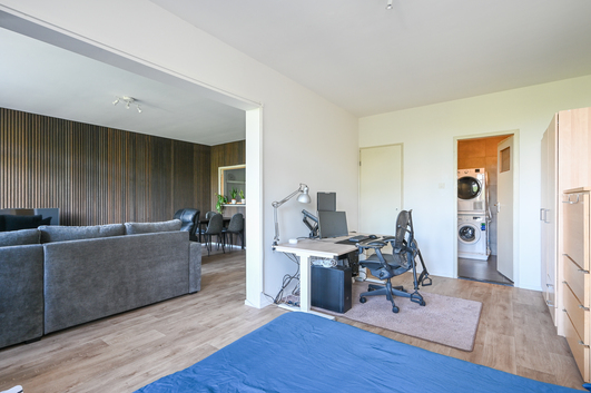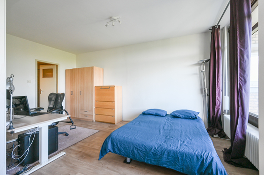 De ruime slaapkamer geeft voldoende ruimte voor een comfortabele thuiswerkplek en handig weggewerkte opstelplaats voor een 50-liter boiler (eigendom). Ook vanuit de slaapkamer heb je toegang tot het balkon.