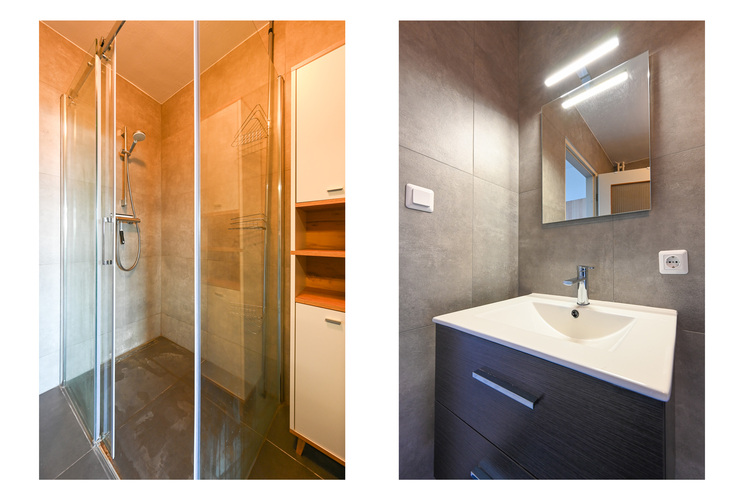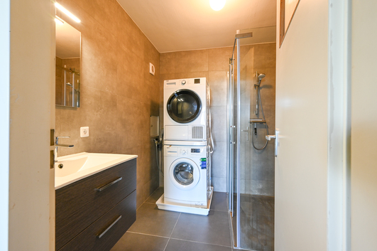 De moderne en volbetegelde badkamer is voorzien van een royale douchegelegenheid, wasmeubel en opstelplaats voor een was-droogcombinatie.