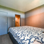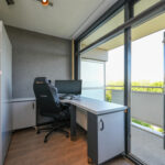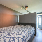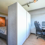 De ruime slaapkamer is slim aangepast met een stijlvolle kastenwand, waardoor er een lichte en comfortabele thuiswerkplek is ontstaan. Ook vanuit de slaapkamer heb je toegang tot het balkon.