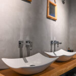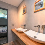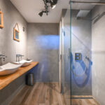 De smaakvolle badkamer is voorzien van een royale inloopdouche, wasmeubel met dubbele waskom en een vaste kast met ruimte voor de wasmachine en een 80-liter boiler (eigendom).