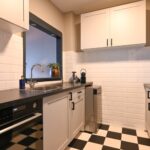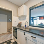 Keuken met 2 rechte opstellingen met een 5 pits gaskookplaat, afzuigkap (recirculatie), vaatwasser, combimagnetron en een losstaande koel-/vriescombinatie.