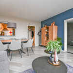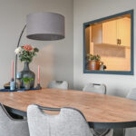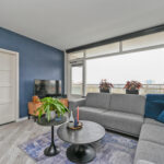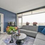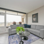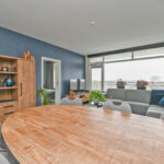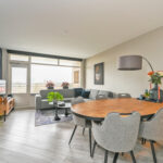 Sfeervolle woon-/eetkamer met toegang tot het royale balkon over de volle breedte van het appartement met een gunstige zonligging om lekker na het werk te genieten van de zon en het vrije uitzicht richting Kijkduin.