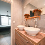 Ruime slaapkamer met aangrenzend een keurige badkamer welke is voorzien van een ligbad met een douchegelegenheid, breed wasmeubel met een dubbele waskom, opstelplaats voor een was-/droogcombinatie en een opstelplaats voor een boiler (huur 80 liter). Vanuit de slaapkamer ook toegang tot het balkon.