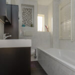 Overloop met twee ruime slaapkamers aan de achterzijde van de woning, waarbij de kleinste kamer is voorzien van een vaste kast. Badkamer aan de voorzijde van de woning met een ligbad, wasmeubel, handdoekenradiator en een 2e toilet met een hangcloset met een inbouwreservoir. De Masterbedroom is aan de voorzijde van de woning gelegen.