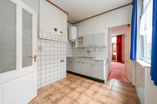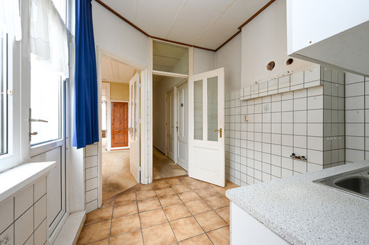 De keuken is zowel vanuit de living als de hal bereikbaar en beschikt over een eenvoudige, rechte opstelling met kastruimte en een opstelplaats voor een boiler (77 liter). Daarnaast is er voldoende ruimte voor een was-/droogcombinatie en een gasfornuis. Vanuit de keuken heeft u toegang tot één van de balkons.