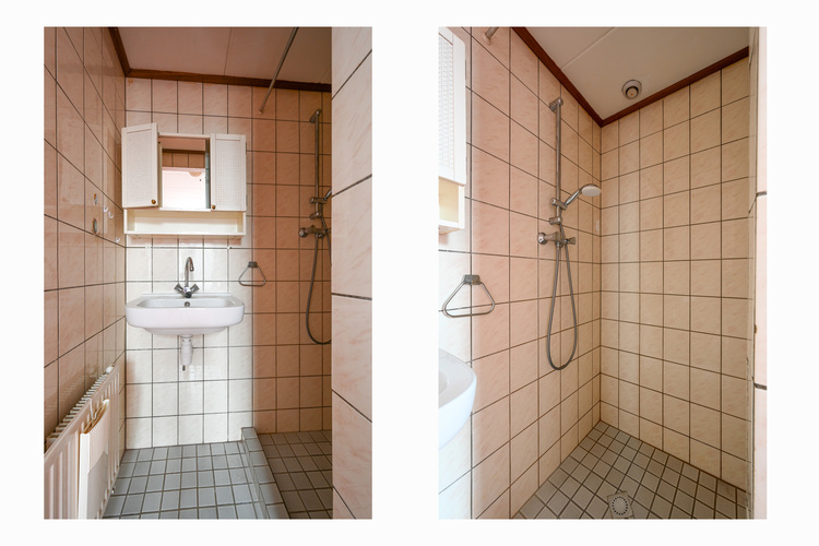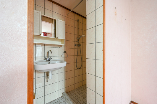 Vanuit de slaapkamer bereikt u de volbetegelde, compacte badkamer, voorzien van een douche en een vaste wastafel.