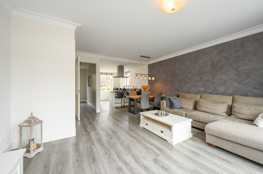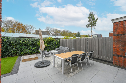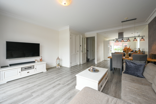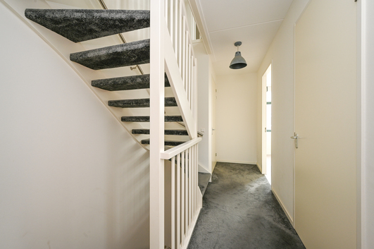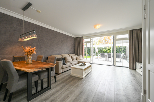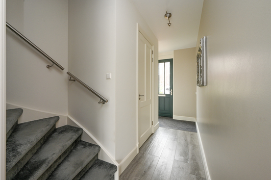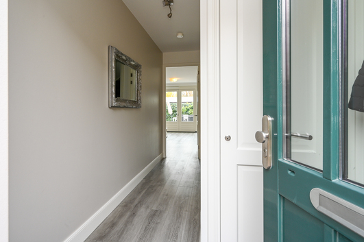 Bij binnenkomst tref je een ruime hal met meterkast (8 groepen) en een modern toilet voorzien van hangcloset, inbouwreservoir en fonteintje. Vanuit de hal bereik je de sfeervolle woonkamer, waarbij de achterpui met veel glas direct voor een lichte en open sfeer zorgt. Via de openslaande deuren loop je zo de brede achtertuin op het noordwesten in. De tuin is een heerlijke plek voor iedereen die privacy waardeert: er bevinden zich geen woningen direct achter de tuin, waardoor je hier meer rust en vrijheid ervaart dan gebruikelijk. Dankzij de gunstige ligging geniet je vanaf circa 11.00 uur tot zonsondergang van veel zonuren. De tuin beschikt bovendien over een poort naar de oprit en een loopdeur naar de garage.
