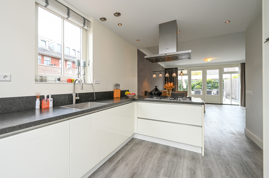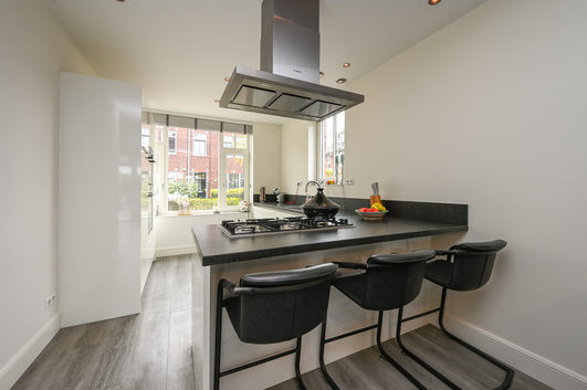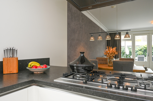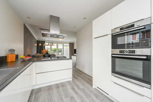 Aan de voorzijde van de woning ligt de moderne keuken in hoekopstelling, voorzien van een strakke kastenwand en een praktische ontbijtbar met drie barkrukken. Een gezellige plek om te borrelen met vrienden of te ontbijten met het gezin. De keuken is uitgerust met een brede 5-pits gaskookplaat, afzuigkap, oven, magnetron, vaatwasser, grote koelkast, grote vriezer en een Quooker.