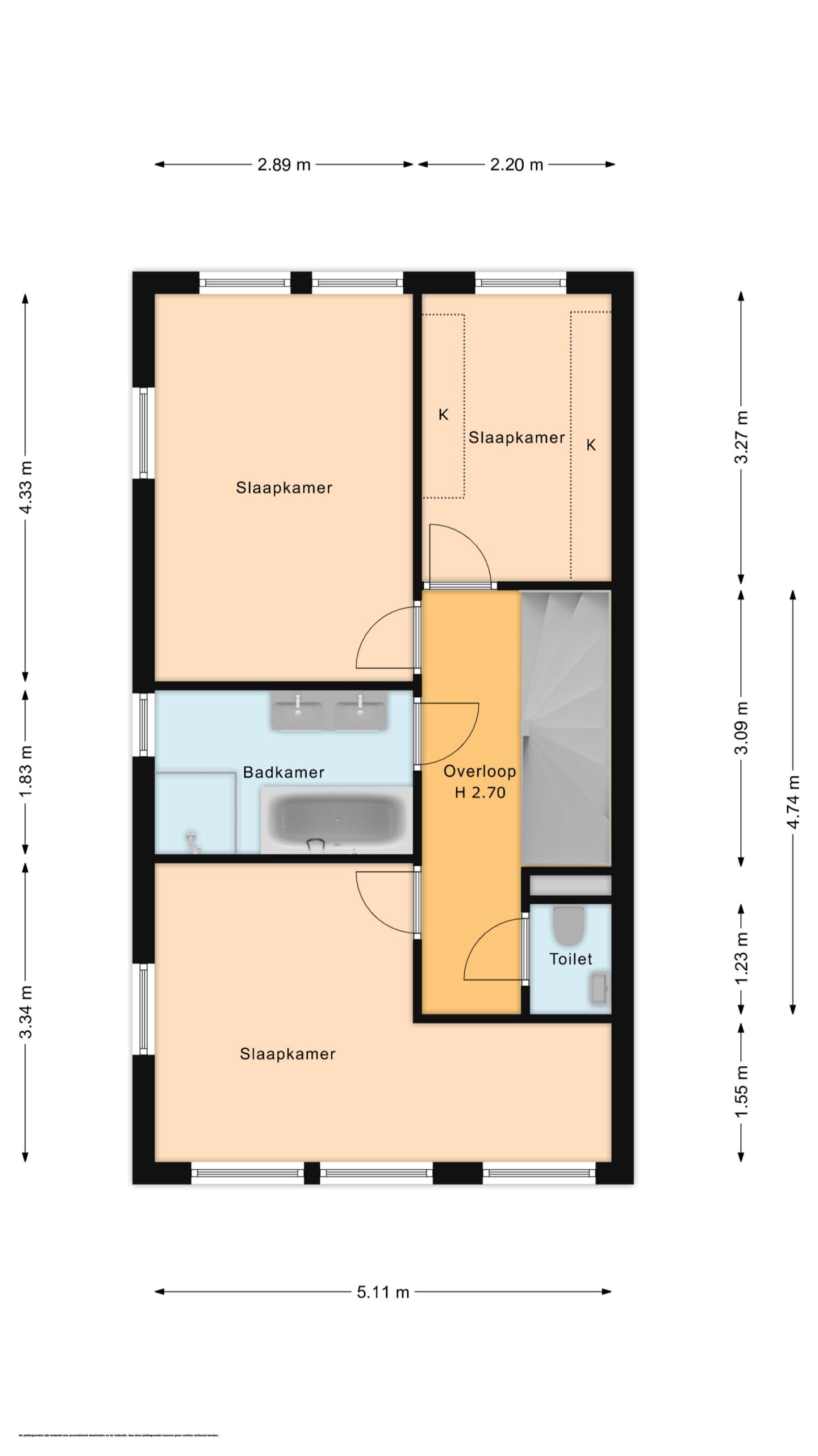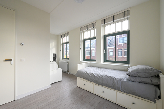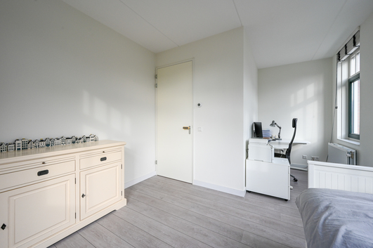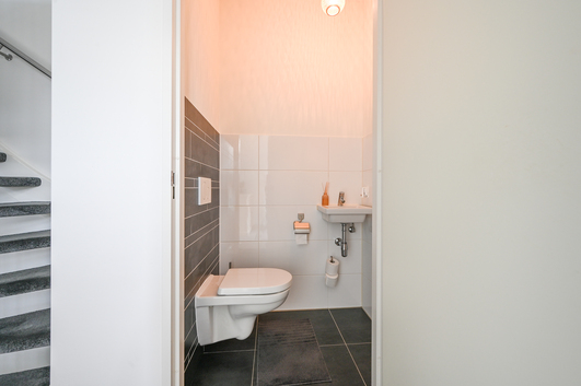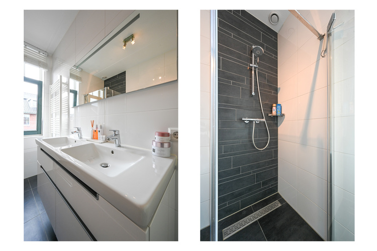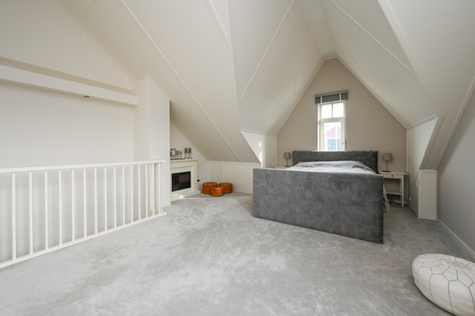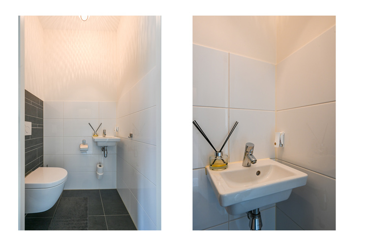 De overloop biedt toegang tot een modern tweede toilet met hangcloset, inbouwreservoir en fonteintje. Aan de voorzijde bevindt zich een ruime slaapkamer, die dankzij de hoekligging profiteert van veel lichtinval.