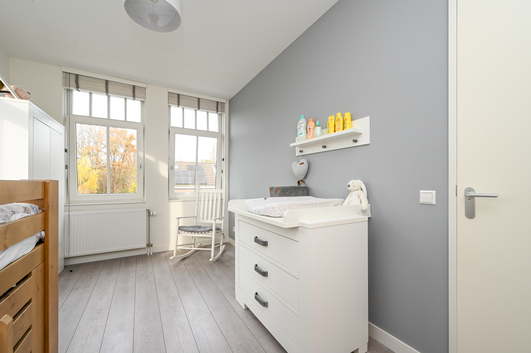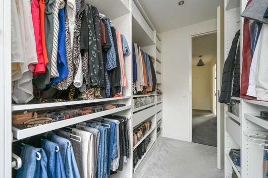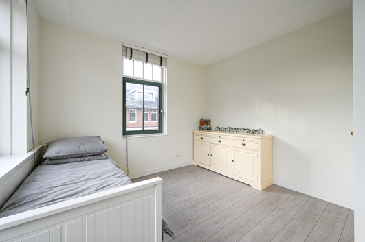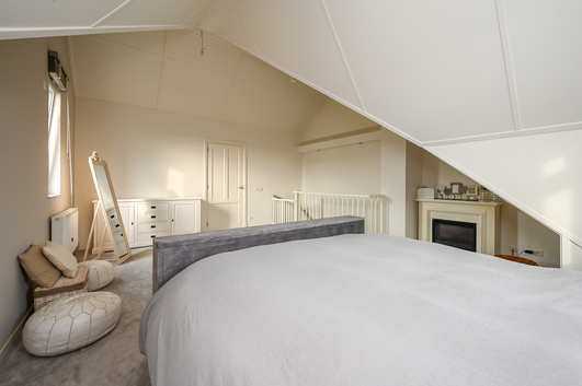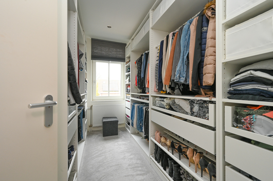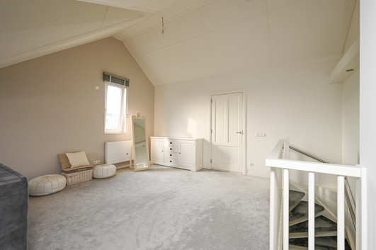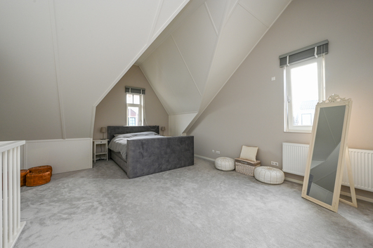 Aan de voorzijde van de woning bevindt zich een riante masterbedroom met een indrukwekkende nokhoogte van circa 3,70 meter, wat zorgt voor een ruimtelijk en licht geheel. Vanuit deze kamer is er toegang tot de wasruimte, voorzien van de unit voor mechanische ventilatie en een hybride lucht/water warmtepomp, bestaande uit een warmtepomp en een cv-deel. Daarnaast is hier de opstelplaats voor zowel de wasmachine als de wasdroger.