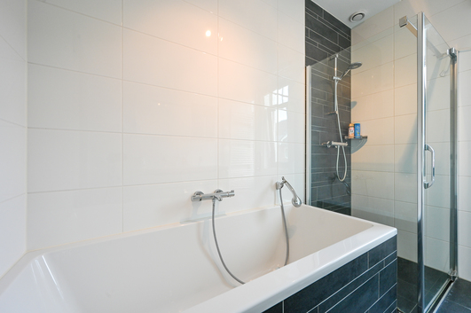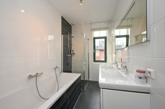 De moderne, volledig betegelde badkamer is stijlvol afgewerkt en uitgerust met een ligbad, separate douche, een breed wastafelmeubel met dubbele kraan en een handdoekenradiator.
