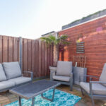 Sfeervolle woonkamer met een vaste kast en openslaande deuren naar de verzorgde achtertuin met sierbestrating, losse planten en fraaie palmboom, houten berging, achterom en een eigen parkeerplaats op achterliggend parkeerterrein. Ideaal voor het uitladen van de boodschappen en door het achterliggende parkeerterrein een weids uitzicht en meer privacy want de buren zijn op grote afstand gelegen.