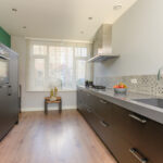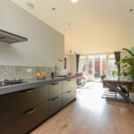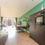 Aan de voorzijde van de woning een luxe keuken in rechte opstelling met een 4-pits gaskookplaat, afzuigkap, vaatwasser en een Quooker. De kastenwand is voorzien van met een koelkast, vriezer en een combi-oven.