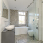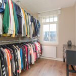 1e verdieping: overloop met twee slaapkamers aan de achterzijde van de woning waarbij de kleinste slaapkamer in gebruik is als een kleedkamer. Masterbedroom aan de voorzijde van de woning. Moderne volbetegelde badkamer met een vrijstaand design ligbad, douchegelegenheid, breed wasmeubel met een dubbele waskom, handdoekenradiator en een 2e toilet voorzien van een hangcloset en inbouwreservoir.